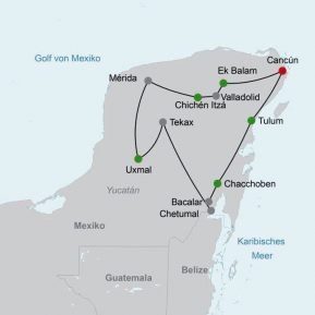 Auch als Pauschalreise inkl. Flug und Transfer buchbar unter CUN15050P. Hinflug je nach Flugverbindungen am gleichen bzw. einen Tag vor Rundreisenbeginn buchen.