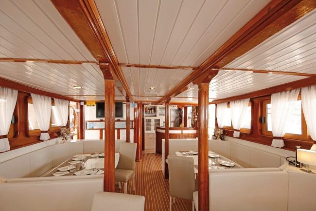 - Ausstattung: Sonnendeck (220 m²) mit 40 Sonnenliegen, Badeplattform mit Duschen am Heck, Stand Up Paddle. Salon mit Klimaanlage für 40 Personen auf dem Oberdeck, gemütliche Sitzgruppen für 40 Personen im Loungebereich auf dem überdachten Oberdeck hinter dem Salon, das witterungsabhängig mit Planen verschlossen werden kann. Tägliche Kabinenreinigung und Handtuchwechsel.