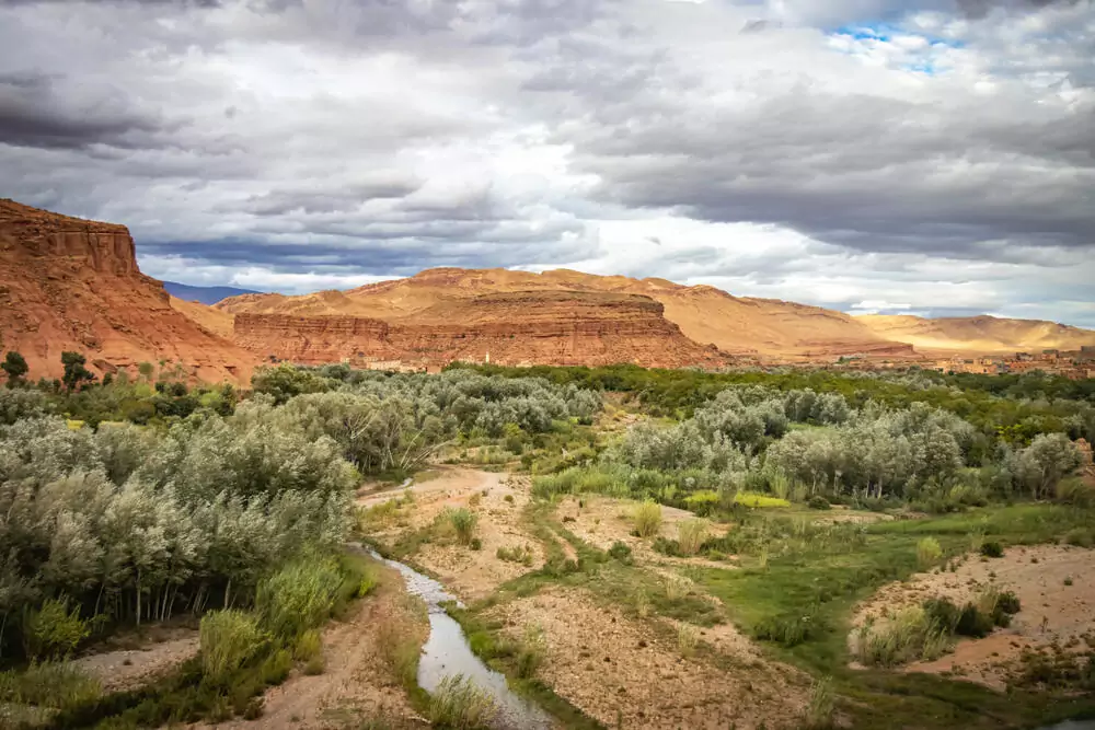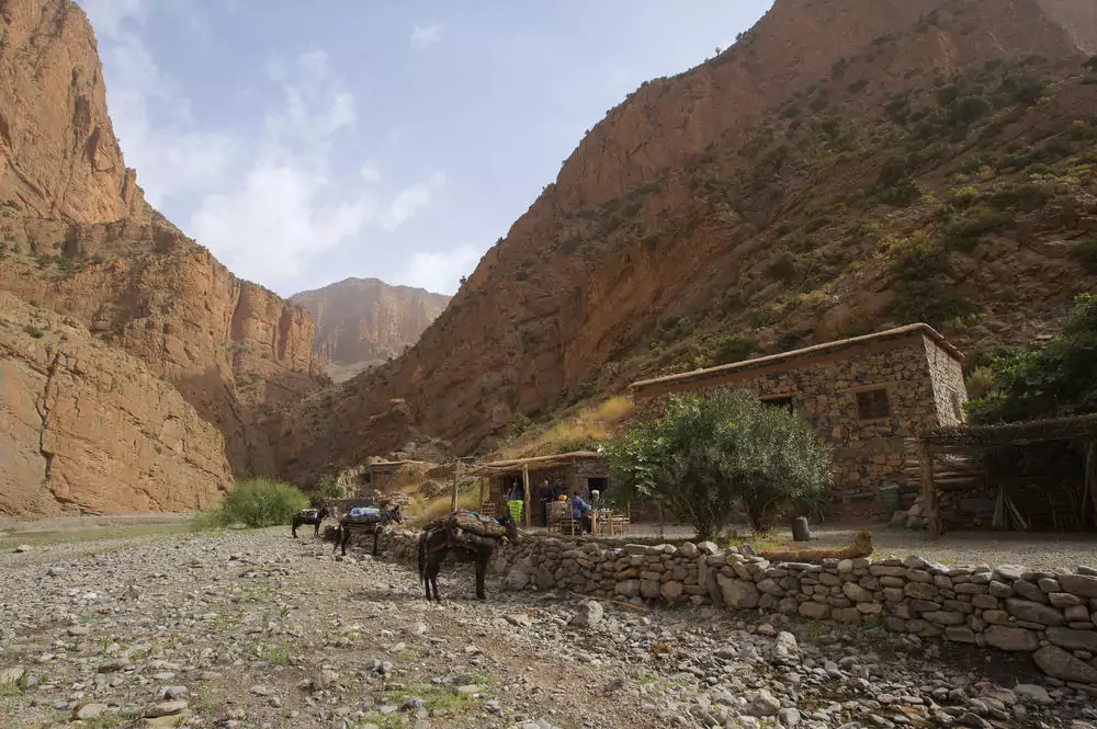 Wir lassen Marrakesch hinter uns und fahren anfangs durch Oliven-, später durch Mandelbaum-Haine und an Kakteenfeldern entlang. Kurz vor Azilal machen wir einen Abstecher zu den Ouzoud-Wasserfällen, die wohl meistfotografierten Kaskaden Marokkos. In Zaouiat Ahansal schultern wir unsere Rucksäcke und wandern durch ein weites Flusstal, bis uns die majestätischen Felswände von Taghia begrüßen. Das Dorf liegt wie ein verstecktes Juwel inmitten eines natürlichen Amphitheaters. GZ ca. 2 Stunden, +400, -200 m. Die untergehende Sonne taucht die rötlichen Wände in ein spektakuläres Licht – Atlasglühen pur! Hüttenübernachtung in Taghia. 240 km. (F, M, A)