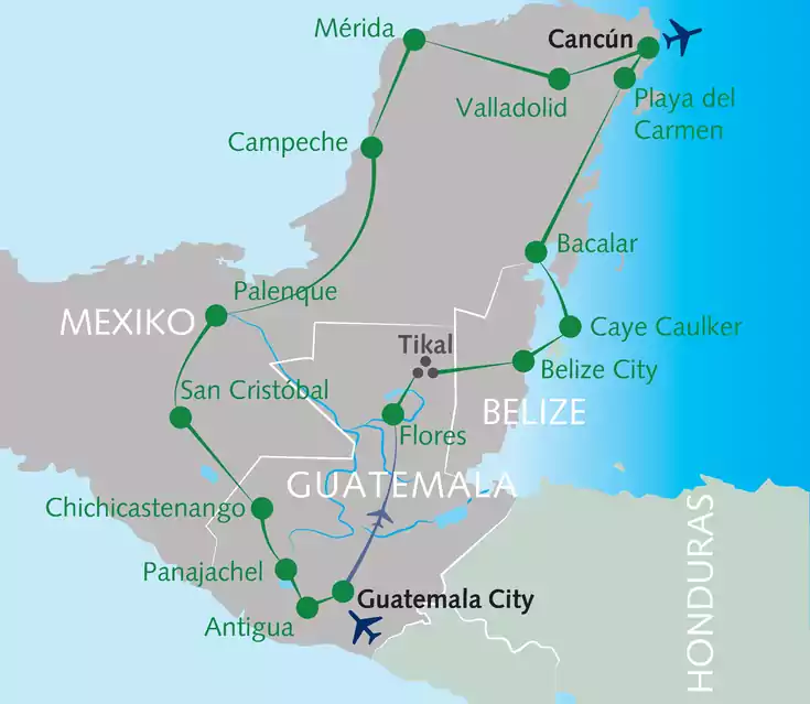 Nach der Erkundung der Mayastätte Yaxhá verlassen wir Guatemala und erreichen Belize, den einzigen englischsprachigen Staat Mittelamerikas. Von Belize City bringt uns ein Wassertaxi zur kleinen Koralleninsel Caye Caulker. Hier erwartet uns Karibikidylle pur mit kristallklarem Wasser, feinen Sandstränden, Mangroven und Kokospalmen. Am 18. Tag erkunden wir das nahegelegene Meeresschutzgebiet bei einer Bootstour mit Schnorchelausflug. Der restliche Tag steht zur freien Verfügung. Am 19. Tag setzen wir unsere Reise fort und fahren per Boot und Bus zurück nach Mexiko, wo die traumhafte Lagune von Bacalar auf uns wartet. 2 Hotelübernachtungen auf Caye Caulker und 1 Hotelübernachtung in Bacalar. 240 km am 17. Tag und 45 km am 19. Tag. (3 x F)