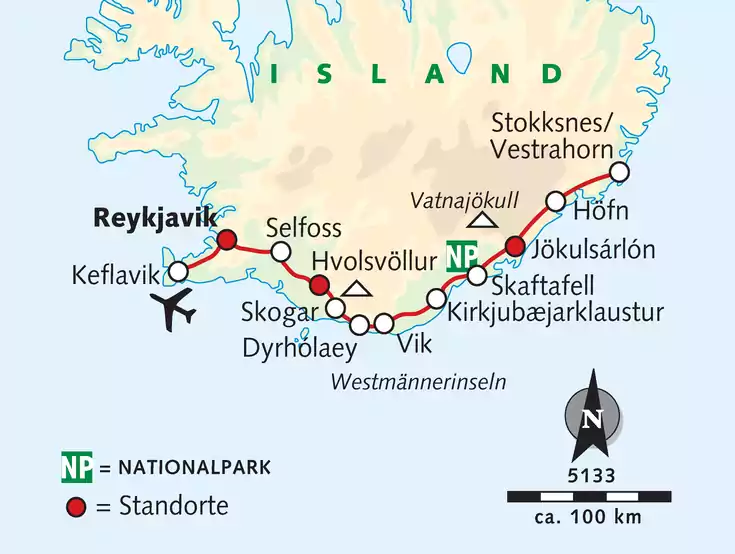 Die ersten 3 Nächte wohnen wir in der weitläufigen Ferienanlage Hellishólar an der Südküste in modern eingerichteten Zimmern des Hotels Eyjafjallajökull. Die Zimmer verfügen über Dusche/WC sowie WLAN, TV und Föhn. 2 Nächte verbringen wir im modernen Fosshotel Glacier Lagoon. Die Zimmer verfügen über Dusche/WC sowie WLAN, TV und Föhn. Die im Reisepreis enthaltenen Mahlzeiten von Tag 1 - 5 nehmen wir im jeweiligen Hotelrestaurant ein. Die letzten 2 Nächte schlafen wir in einem zentral gelegenen Mittelklassehotel in Reykjavik. Deine Reiseleitung macht dir Restaurantvorschläge für die nicht inkludierten Abendessen in Reykjavik.