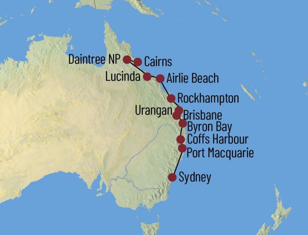 Während Ihres Roadtrips entlang der Ostküste Australiens unternehmen Sie eine Bootstour nach K´gari (Fraser Island), beobachten Dugongs und entspannen an Traumstränden. Segeln Sie zu den puderzuckerweißen Stränden der berühmten Whitsunday Islands und unternehmen eine Fahrradtour entlang der Küste von Airlie Beach. Ein Besuch im Daintree-Nationalpark, einer der ältesten Regenwälder der Welt, und ein Schnorchelausflug zum Great Barrier Reef darf natürlich auch nicht fehlen.