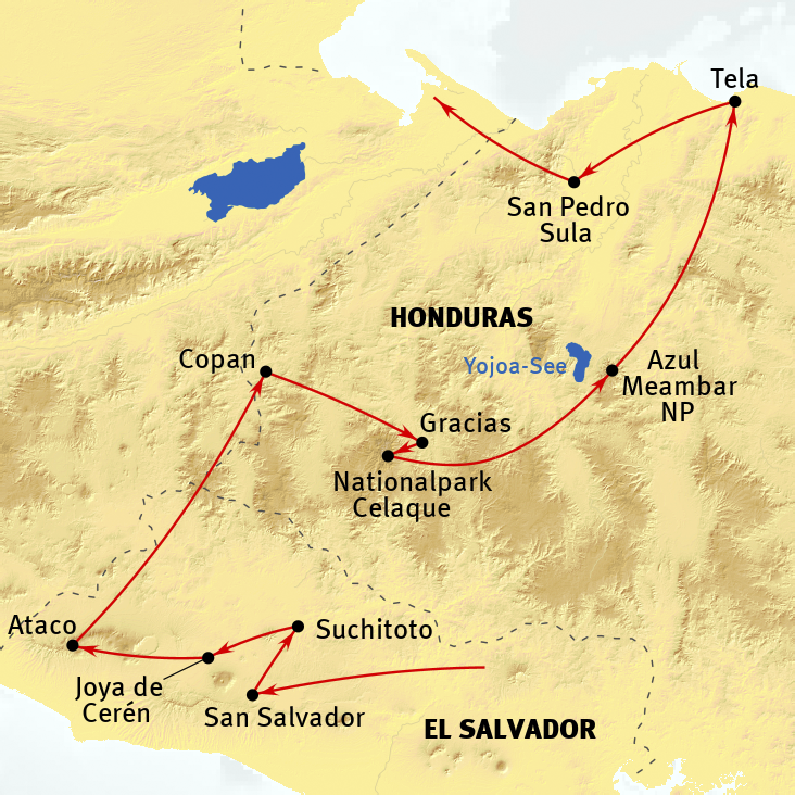 Honduras begeistert mit einer Fülle von Attraktionen, die man in ihrer Ursprünglichkeit und Unberührtheit eindrucksvoll erleben kann. Vor allem die Vielfalt der Besuchspunkte macht eine Reise durch Honduras so abwechslungsreich: Mit kolonialen Städtchen, bedeutenden Mayastätten, überwältigender Natur mit verschiedenster Fauna und Flora sowie idyllischen Strand- und Küstenregionen reiht sich ein Höhepunkt an den nächsten. Dabei ist Honduras bislang – abgesehen von Abstechern zu den Ruinen von Copan oder Bade- und Tauchaufenthalten auf den Bay Islands – eines der touristisch am wenigsten frequentierten Länder Mittelamerikas. Dazu El Salvador, das kleinste und ebenfalls noch recht wenig besuchte Land in Mittelamerika, das – betrachtet man die Landkarte – ein Teil von Honduras sein könnte. Nicht weit von San Salvador bietet die Maya-Stätte Joya de Ceren spannende Einblicke. Besonders sehenswert sind auch Suchitoto, der Cerro Verde Nationalpark sowie die Maya-ruinen von Tazumal.