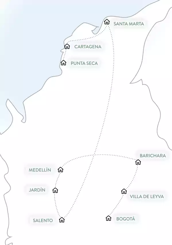 Kaffeeduft. Bunte Städte. Karibikfeeling. Alles dabei. - Lust auf ein Land, das dich jeden Tag aufs Neue überrascht? Nebel schwebt über sattgrüner Landschaft, Palmen ragen still in den Himmel, Städte vibrieren voller Klang. Zwischen Regenwald und Karibikküste liegen Dörfer wie aus der Zeit gefallen: weißgetünchte Wände, Pflastergassen, Herzlichkeit. Rhythmus und Ruhe, Natur und Kultur – alles gleichzeitig, alles echt. Das sind unsere 16 Tage Kolumbien.