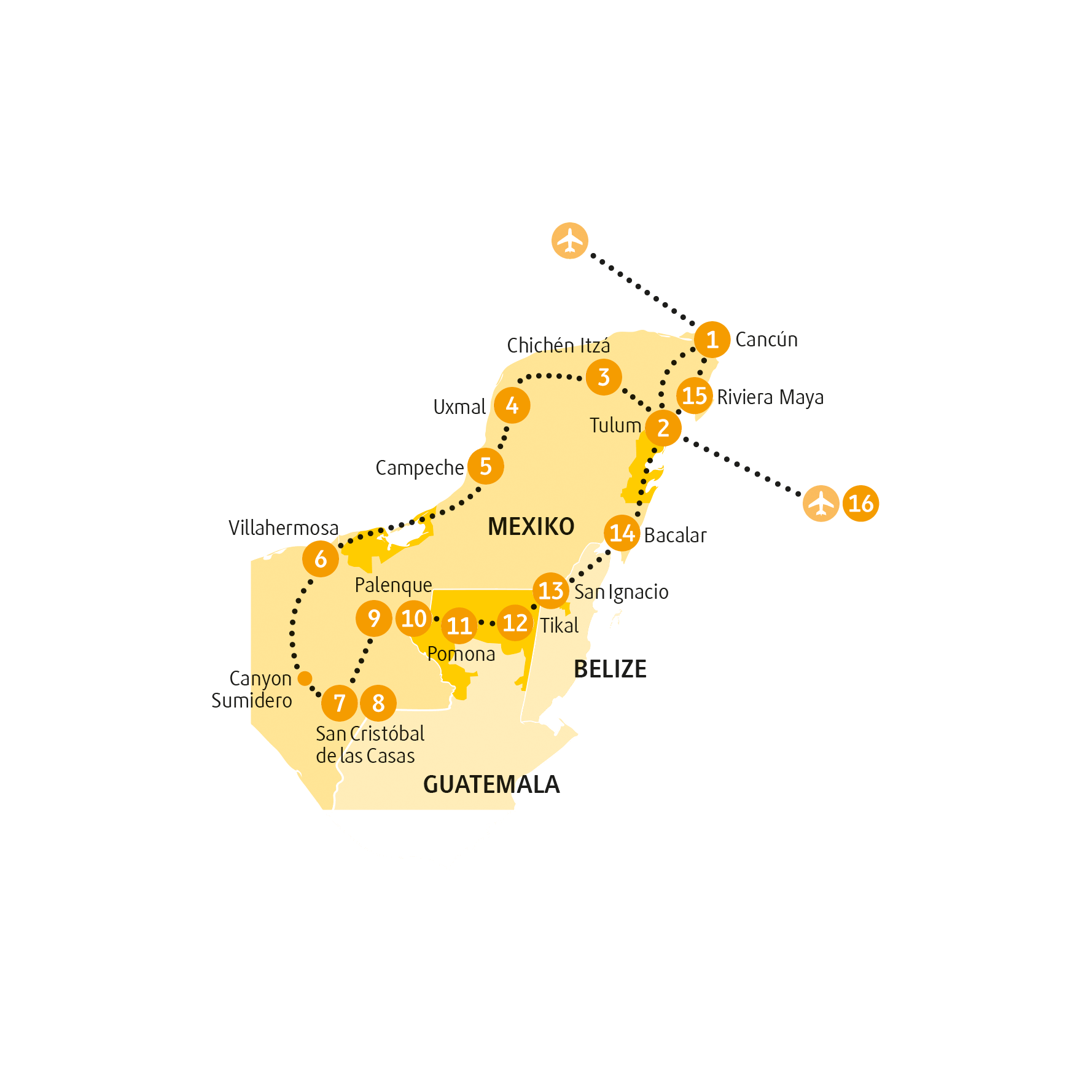 Der Bootsausflug im Cañón del Sumidero kann bei Niedrigwasser oder schlechten Wetterbedingungen entfallen. Die Kirche in Chiapa de Corzo kann teilweise nur von außen besichtigt werden (aufgrund der Öffnungszeiten und Reparaturarbeiten).