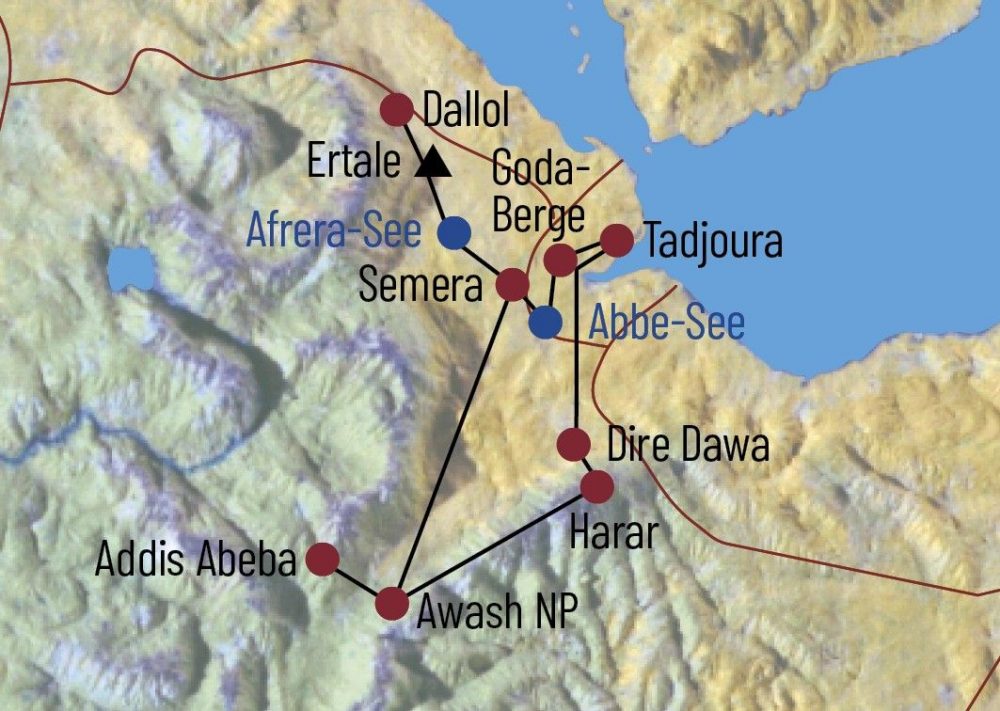 Dieses besondere Wüstenabenteuer führt Sie von der Heiligen Stadt Harar über den Awash-Nationalpark in eines der spektakulärsten Geothermalgebiete der Welt. Die einst vom Meer bedeckte Danakil-Senke gilt als eine der heißesten und vulkanisch aktivsten Gegenden der Erde. Erkunden Sie die traumhafte Szenerie des Afambo-Sees, berauschen Sie sich am Farbspiel der Schwefelfelder von Dallol und schauen Sie in den brodelnden Schlund des Erta-Ale-Vulkans. Die „Mund-zu-Maul-Fütterung“ der Hyänenmänner von Harar, die Begegnungen mit den Herren der Wüste, den Issa- und Afar-Nomaden, und nicht zuletzt Wohltaten, wie das Baden in den heißen Quellen im Awash-Nationalpark und im Afrera-See, machen diese Expeditionsreise unvergesslich.