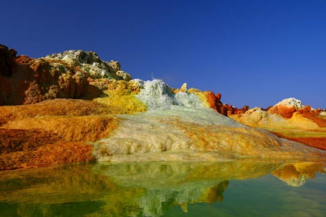 Heute geht es zunächst zurück nach Semera und nachdem bei der Regionalverwaltung alle Papiere für Ihre Danakil-Expedition entgegen genommen sind, fahren Sie weiter in einen der faszinierendsten Landstriche der Erde. Die Danakil-Senke, ca. 135 m unter dem Meeresspiegel, gilt als vulkanisch aktivste Gegend der Welt. Am späten Nachmittag erreichen Sie den salzhaltigen Afrera-See, der von über 200 sprudelnden Quellen gespeist wird. Nutzen Sie die Gelegenheit für ein schwereloses Bad im See. Übernachtung im Zelt. (Fahrzeit ca. 6h, 320 km).