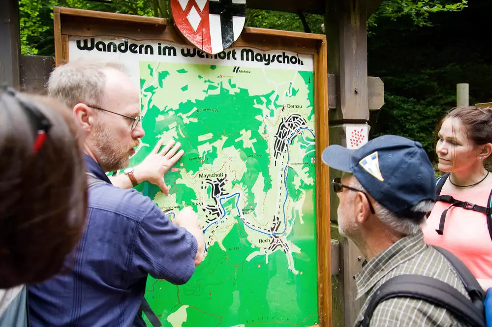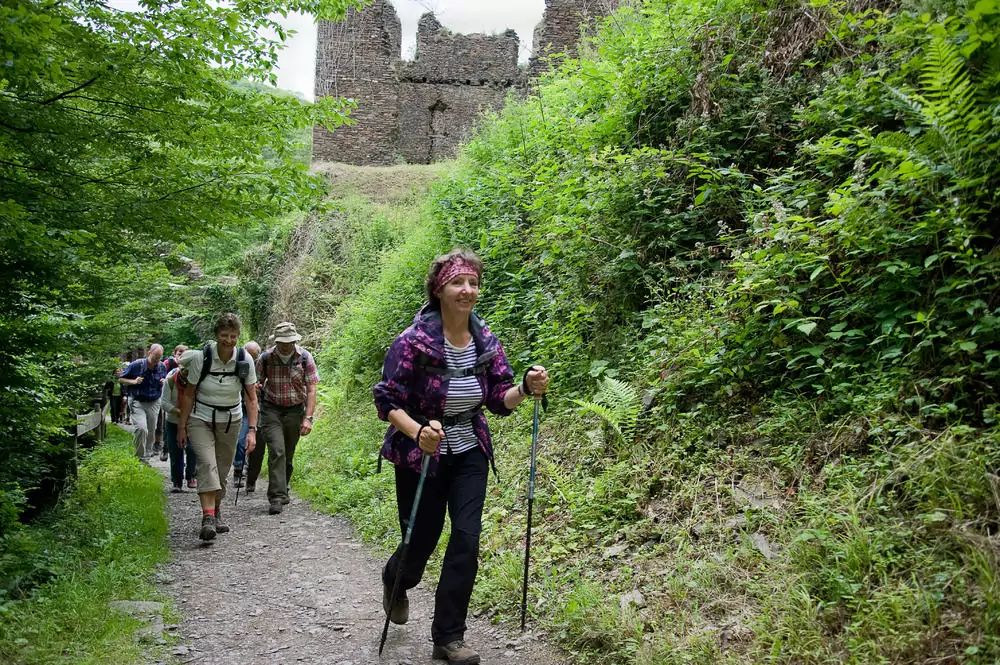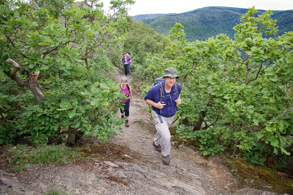 Vom Bahnhof in Mayschoß steigen wir hinauf zu großartigen Panoramablicken – am Mohrenkopf und auf dem Ümerich (311 m) lassen wir das Ahrtal zu unseren Füßen liegen. Später stoßen wir erneut auf den Rotweinwanderweg, den wir für ein kurzes Stück bis nach Altenahr begleiten! In Altenahr wechseln wir die Ahrseite und nehmen Kurs auf den Aussichtspunkt „Schwarzes Kreuz“. Dann beginnt ein besonders spektakulärer Abschnitt des Ahrsteigs: Auf schmalem, abenteuerlich verlaufendem Pfad geht es vorbei am sagenumwobenen Teufelsloch. Oberhalb der Ahrschleife im Langfigtal steigen wir zur markanten Teufelsley auf – ein großartiger Ort zum Durchatmen. Den Abschluss bildet die Burgruine Saffenburg, wo wir bei schönem Ausblick unsere Tour gemütlich ausklingen lassen (GZ: 4 ½ Std., +/- 200 m).