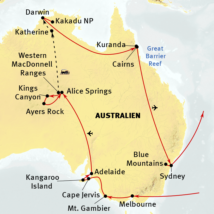 - als Besonderheit die Zugfahrt mit dem legendären Wüstenzug, dem „GHAN“ von Alice Springs nach Darwin, mit Übernachtung im Schlafwagen in der Kategorie "Gold Class"