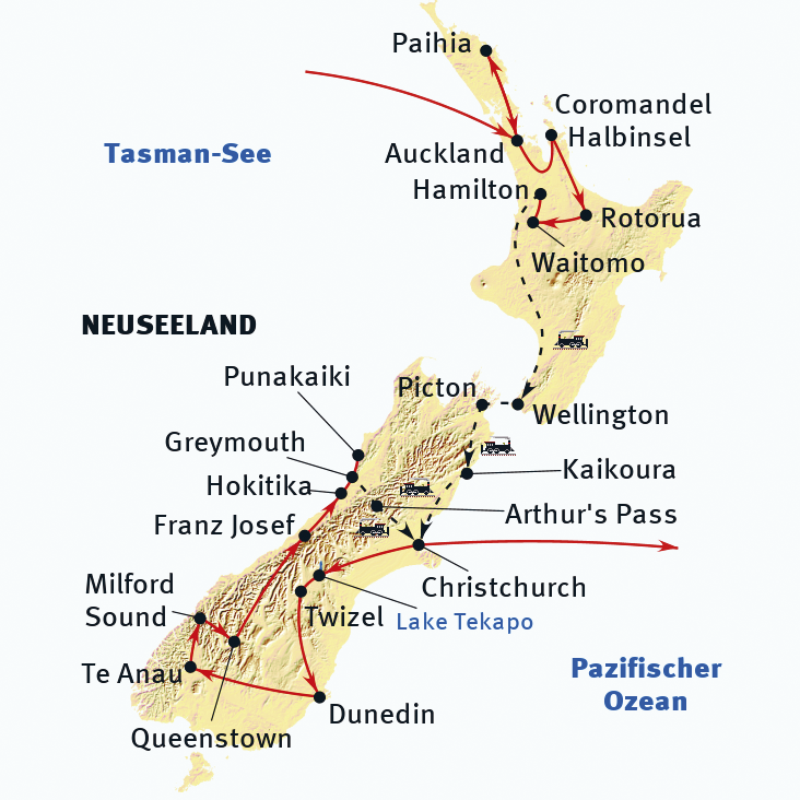 Neuseeland bietet atemberaubende Natur und die Kultur der Maori, kombiniert mit modernen Städten. Auf dieser Reise erkunden wir das Land nicht nur per Bus, sondern auch mit Personenzügen. Ein Geheimtipp: die DRIVING CREEK Eisenbahn durch Coromandels Farnwälder. Der NORTHERN EXPLORER führt von den Vulkanlandschaften des Tongariro-Nationalparks nach Wellington. Der COASTAL PACIFIC EXPRESS bietet Meerblicke an der Ostküste der Südinsel. Von Dunedin aus erleben wir die TAIERI GORGE RAILWAY, eine Museumseisenbahn. Abschließend geht es mit dem TRANZALPINE EXPRESS über die Südalpen, bekannt für eine der schönsten Zugfahrten weltweit. Alle Zugstrecken sind auf Schmalspur und führen durch Landschaften, die für Busse und Autos nicht zugänglich sind. Modern ausgestattete Züge mit offenem Aussichtswagen. Ergänzt werden kann die Rundreise mit einem Vorprogramm in der Bay of Islands. Optional kann die Route auch mit einer Australienreise kombiniert werden, um Züge wie den GHAN oder den INDIAN PACIFIC zu erleben.