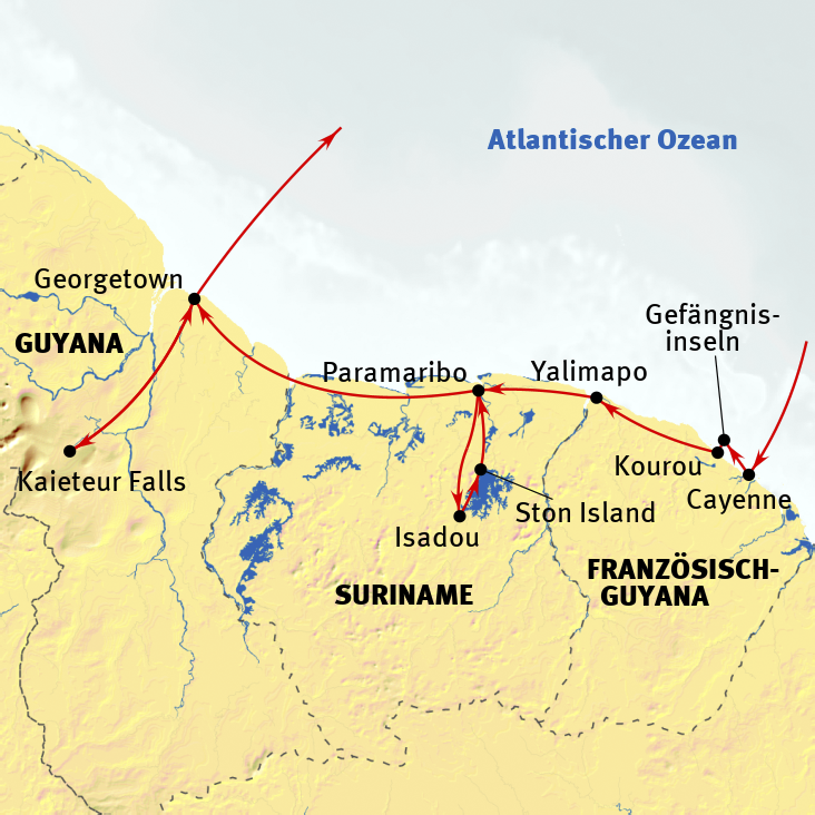 Die zwei Guyana-Staaten Guyana und Suriname sowie das französische Überseedepartement Französisch Guyana sind die einzigen Länder des Südamerikanischen Kontinents, in denen nicht spanisch oder portugiesisch gesprochen wird. Sie zählen zu den am wenigsten vom Tourismus frequentierten Länder des Kontinents. Umso reizvoller die Idee, diese drei Guyanas – in einer Reise verbunden – zu entdecken. Vornehmlich besiedelt sind die Küstenregionen, während im Hinterland noch unberührter Regenwald zu finden ist. Die Bevölkerung ist eine bunte Mischung aus Menschen verschiedener Abstammungen. Wir wollen die typischen Sehenswürdigkeiten der drei Länder besuchen, fast ausschließlich zu Lande reisen und die Vielfalt erleben: von Kulturen, kolonialem Erbe, Flora und Fauna bis zum europäischen Weltraumzentrum. Uns erwartet ein tropisches Klima und Unterkünfte, die - teils rustikal - dennoch komfortabel sind.