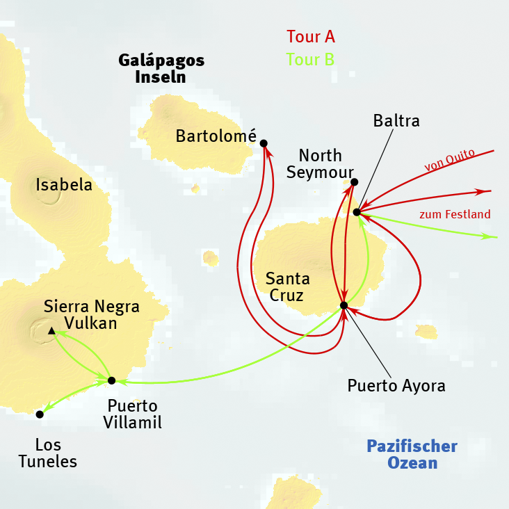 Die Galápagos-Inseln auf Äquator-Höhe, gut tausend Kilometer westlich des südamerikanischen Kontinents gelegen, sind ein Traumziel für Naturfreunde. Hier scheint die Zeit stehengeblieben zu sein. Vegetation und Tierwelt bilden ein Paradies, die wohl größte zoologische Sensation weltweit. Ein Galápagos-Aufenthalt gilt als exklusives und kostspieliges Abenteuer. Der Besuch ist streng limitiert, was zu einer gewissen Exklusivität führt. Daher freuen wir uns besonders, mit diesem günstigen Tourangebot Galápagos vielen zugänglich zu machen, die bisher nur davon träumen konnten. Anders als bei den meisten Touren übernachten wir nicht auf dem Schiff, sondern auf ein oder zwei Inseln. Mit Tour A gibt es einen fünftägigen Aufenthalt auf Santa Cruz. Tour B erweitert das Galápagos-Erlebnis auf neun Tage mit zusätzlich vier Übernachtungen auf Isabela. Vorher erkunden wir Ecuador: Quito, Otavalo und den Cotopaxi-Nationalpark.