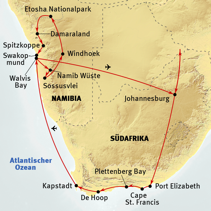 Südafrika und Namibia grenzen aneinander und lassen sich ideal kombinieren. Der Kontrast ist beeindruckend: Südafrika mit der Gartenroute zeigt sich grün und üppig mit spektakulären Küsten, Wäldern und malerischen Orten wie Cape St Francis und Hermanus. Kapstadt bietet das Postkartenmotiv Tafelberg. Namibia hingegen beeindruckt mit der ältesten Wüste der Welt, dramatischen Landschaften und faszinierenden Highlights wie den Dünen von Sossusvlei, der Hafenstadt Walvis Bay und Swakopmund. Im Etosha-Nationalpark erwarten uns Safaris und die Suche nach Wüstenelefanten im Damaraland. Während wir in Südafrika auf Teerstraßen reisen, sind es in Namibia oft Schotterstraßen. Beide Länder bieten herzliche Gastfreundschaft, hervorragende Küche und charmante Unterkünfte in schöner Lage. Unvergessliche Erlebnisse erwarten uns.