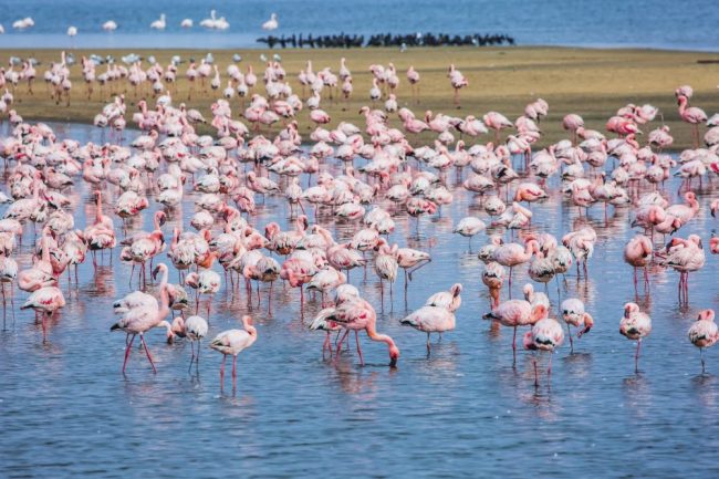 Transfer zum Flughafen. Der Flug bringt uns in die namibische Tiefseehafenstadt Walvis Bay - hier erwartet uns die namibische Reiseleitung - , bis 1994 noch eine südafrikanische Enklave und nach der Unabhängigkeit dem namibischen Staatsgebiet rechtlich zugesprochen. Die glitzernde Lagune mit Watt ist ein herrlicher Anblick. Wir sehen tausende von Flamingos und Pelikane. Östlich der Bucht beginnt bereits die Namib-Wüste.