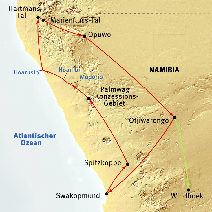 Der hier dargestellte Ablauf ist die geplante Route. Es gibt keine bestimmten Besuchs- oder Besichtigungspunkte. Wir sind unterwegs in unerschlossenen Regionen, fahren dorthin, wohin uns der Weg führt, halten an, wo es schön ist, wandern, besteigen kleine Hügel, sehen Höhlen und kuriose Felsformationen. Wir suchen wilde Tiere und treffen auf Einheimische, jedoch eher selten andere Touristen. Wir genießen einfach die Freiheit; die wilde, reizvolle Schönheit der Natur fasziniert, beeindruckt, überwältigt. Wir lassen dem Expeditionsleiter Freiraum, die Route bei Notwendigkeit zu ändern. Ein vorgereistes Serviceteam legt fest, wo wir übernachten, sucht dafür die schönsten Stellen und baut für uns das Lager auf- und wieder ab. Einige frühe Abfahrten, manchmal erreichen wir das Lager erst spätnachmittags, am Tagesende - immer mit knisterndem Lagerfeuer und kaltem Bier. Zu Anfang der Inselberg Spitzkoppe, unfassbare 700 Mio.-Jahre alt. Die höchste Erhebung wird Namibias Matterhorn genannt. Hier finden sich Felsmalereien und markante Felsformationen. Es folgen die unendlichen Weiten der Damaraland-Felswüste, keine ausgewiesenen Pisten, keine Zivilisation, weit und breit wohl nur wir. Wir suchen Xai-Ais auf, eine geheime Quelle, die Wildtiere anzieht. Überreste von Steinhaufen lassen vermuten, dass sie einstige Behausungen der damaligen berittenen deutsch-südwestafrikanischen Polizei waren, die hier während der Wüstenpatrouillen mit Kamelen ihren Rastplatz hatten. Wir ziehen weiter durch die riesige Wildnis, die Palmwag-Konzession, ein kommunales Schutzgebiet, welches die benachbarte Bevölkerung Flora und Fauna überließ. Basaltgestein mit seltenen Aloen und giftigen Euphorbien, Kegel- und Tafelberge sowie wilde Schluchten prägen das urzeitliche Rückzugsgebiet von Wüstenlöwen, Spitzmaulnashörnern und Elefanten. Wir versuchen, sie aufzuspüren. Im Mudorib-Canyon zwei Übernachtungen. Ein Tagesausflug in das sandige Hoanib-Flussbett, ein saisonaler Trockenfluss, seitlich begrenzt durch Berge und Dünen, ein Flusstal mit Oasencharakter. Savanne mit Mopane-, Ana- und Kameldornbäumen sowie hochwachsende Gräser und Schilf in den feuchten Zonen bieten den Wüstenelefanten ein optimales Lebensumfeld. Sicherlich ein erlebnisreicher Tag. Unser Weg führt weiter nach Hoarusib, ein Trockenflussbett mit Kalksteinformationen, in Ufernähe "Lehmburgen", Tonformationen geformt aus Ablagerungen und Erosionen sowie Kalksteinhöhlen. Das Wasser des Flusses, wenn er fließt, strömt durch einen engen Canyon. Hier wachsen Makalani-Palmen aus den hierher gespülten Früchten. Unterwegs sehen wir lebensgroße "Steinmänner", große Skulpturen aus Steinen mit Draht zusammengehalten, die ein anonymer Künstler hier platziert hat. Niemand weiß, wer er ist. Die stummen Gestalten regen Sinne an und sorgen für Gesprächsstoff. Irgendwann erreichen wir Hartmans Valley, benannt nach seinem Erkunder. Das Gebiet erstreckt sich von Süd nach Nord, fällt dann abrupt in das Kunene-Flussbett ab. Der Blick von der Abbruchkante ist fantastisch, wir sehen Dünen, schroffe Berge und den Grüngürtel am Flussbett. Ein einzigartiges Fleckchen Erde. Das Wetter kann hier dramatisch wechseln, denn der atlantische Küstennebel zieht bis hierher, die frühmorgendlichen Nebelschwaden verbreiten eine gewisse Unheimlichkeit. Tiefsandpisten bringen uns in das Tal des Marienflusses, welches sich bis ganz in den Norden, bis zur Grenze des Nachbarlandes Angola erstreckt. Hier fließt der Kunene-Grenzfluss. Im ausgedehnten Tal die Weidegründe von Rindern und Schafen der halbnomadischen Himba, die korrekt eigentlich Ovahimba heißen und denen wir hier im Nordwesten immer wieder begegnen. Ihre Lebensart weitestgehend unberührt von westlicher Zivilisation mit einzigartigen Bräuchen und Traditionen, für uns wohl eher befremdlich. Die Haut wird mit Ocker gefärbtem Fett eingerieben, die Haare besonders kunstvoll geflochten. Selbstgemachter Schmuck aus Draht, Leder, Perlen und Muscheln verschönern beide Geschlechter. Auch das Wildleben beeindruckt, hier schleichen Leopard und Gepard umher, Giraffen, Springböcke, Strauße und Bergzebras grasen im Tal, im Fluss leben große Krokodile. In dieser Region finden sich auch die Feenkreise, ein bislang ungeklärtes Phänomen. Die mysteriösen Kreise inmitten der Landschaft sind kahle, vegetationslose Stellen, von kräftigen Grasbüscheln umwachsen. Bis heute sind sich Forscher nicht einig, was zu dieser, sich selbst erhaltenden Erscheinung, führt. Wir fahren im Tal umher, sehen die landschaftlich schönen Epupa-Fälle.