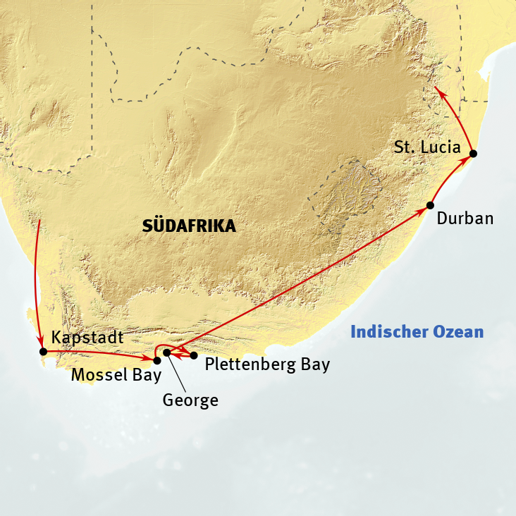 Südafrika ist faszinierend und beeindruckend - jeder sollte dieses einzigartige Land erleben. Wir wollen mit dieser Mietwagen-Rundeise alle für das Land am Kap begeistern. "Für alle" meint Familien mit Kindern, Junggebliebene, Erstreisende, Wiederholer, Abenteurer und Entspannte. Unsere Reise mit angepassten Unterkünften bietet viel Flexibilität und ein gutes Preis-/Leistungs-Verhältnis. Die Teilnehmer bestimmen das Programm selbst, es kann aber auch gegen Aufpreis eine geführte Individualtour gebucht werden. Ohne ständig den Standort zu wechseln, aber viel sehen und erleben. Von Kapstadt zur Gartenroute und in das malariafreie Kwa Zulu Natal. Im UNESCO-Weltnaturerbe iSimangaliso Wetland Park erwarten uns Kultur, Tierwelt, Badestrände und saisonale Ereignisse. Wir realisieren auch individuelle Wünsche. Die Regenbogennation wartet auf uns.