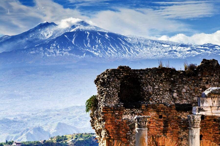 Meist blufft der Ätna (UNESCO-Welterbe) nur, manchmal macht er auch Ernst. Hoffentlich nicht gerade heute! Durch Zitronenhaine, Weingärten und Lavafelder windet sich unser Bus bis auf 1900 m, und wir spazieren zu den Crateri Silvestri, den kleinen Nebenkratern. Wer ganz hoch hinaus will, steigt in Seilbahn und Jeeps (ca. 80 €, wetterabhängig) um und begutachtet in 3000 m Höhe die Spuren der letzten Ausbrüche. Durchgefroren? Ihre Reiseleiterin heizt mit hochprozentigen Tropfen das innere Feuer an. Dann zum Reisefinale nach Taormina: Ist die Jetset-Ära auch längst passé, die Stadtkulisse bietet nach wie vor reichlich Glamour. Der Blick aufs schönste Bühnenbild Siziliens im griechisch-römischen Theater – die "vista sul mare" mit dem Kegel des Ätnas – ist ein ganz beeindruckender Höhepunkt zum Schluss. Beim Abendessen im Hotel freuen wir uns dann noch einmal über sizilianische Genüsse und nehmen Abschied von Bella Sicilia. 110 km. (F, A)
