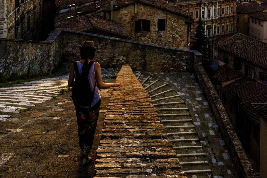 Unterhalb von Perugia machen wir halt am unterirdischen Grab der Etruskerfamilie der Volumni und tauchen in die Frühgeschichte der Region ein. Dann aber genießen wir das urbane Flair von Perugia. Die umbrische Hauptstadt ist Sitz der Ausländeruniversität - und Vorreiter in Sachen Verkehrsberuhigung: Ein geniales System an Rolltreppen und eine MiniMetro verbinden oben und unten. Auch wir rollen damit bequem und umweltfreundlich in die mittelalterliche Oberstadt, wo wir uns den Dom und den Stadtbrunnen Fontana Maggiore ansehen. Haben Sie auf die Glasfenster im Dom geachtet? Einige davon stammen aus dem traditionsreichen Kunstglasstudio, in dem uns eine der Künstlerinnen zeigt, wie die kostbaren Fenster hergestellt werden. Nach dem Mittagessen in einer Trattoria haben Sie sich zum Dessert einen Kuss verdient! Aus Schokolade: Die süßen Baci di Perugia sind unwiderstehlich! Auch Peruginos Fresken im Collegio del Cambio lassen uns staunen. Anschließend bleibt Zeit zum Flanieren über den Corso Vannucci oder für einen Caffè in der Jugendstilbar Sandri. 40 km. Abendessen in Eigenregie. (F, M)