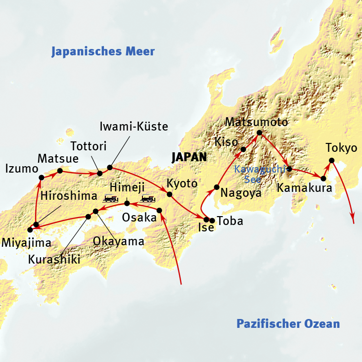 Willkommen zu einer unvergesslichen Reise durch die faszinierende Welt Japans. Eine Reise, die uns mit zahlreichen hochkarätigen Besichtigungspunkten „das wahre“ Japan näherbringt. Von Osaka, einer Metropole, die Tradition und Moderne verbindet, geht es zur majestätischen Burg Himeji, einem UNESCO-Weltkulturerbe, und weiter nach Kurashiki mit seiner historischen Altstadt. Die Insel Miyajima verzaubert uns mit dem schwebenden Torii-Tor, während der Friedenspark in Hiroshima an die Botschaft des Friedens erinnert. Die heilige Stadt Izumo eröffnet Einblicke in die japanische Mythologie, und Matsue beeindruckt mit seiner Burg. Kyoto, eine Schatzkammer traditioneller Tempel, Schreine und Gärten, ermöglicht uns eine tiefere Verbindung zur japanischen Kultur. In Kamakura erhebt sich der Große Buddha, und die Reise endet in der Metropole Tokyo, wo moderne Architektur, Technologie und Popkultur auf traditionelle Tempel und Gärten treffen.