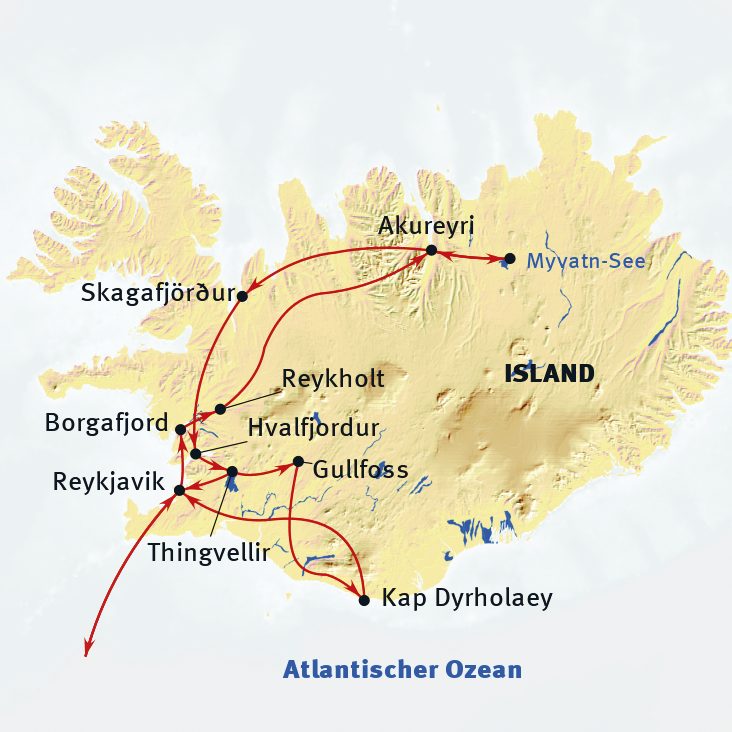 - Auf einen Blick achttägige geführte Island-Busrundreise mit durchgehender, dt. spr. Reiseleitung (2.-7. Tag)