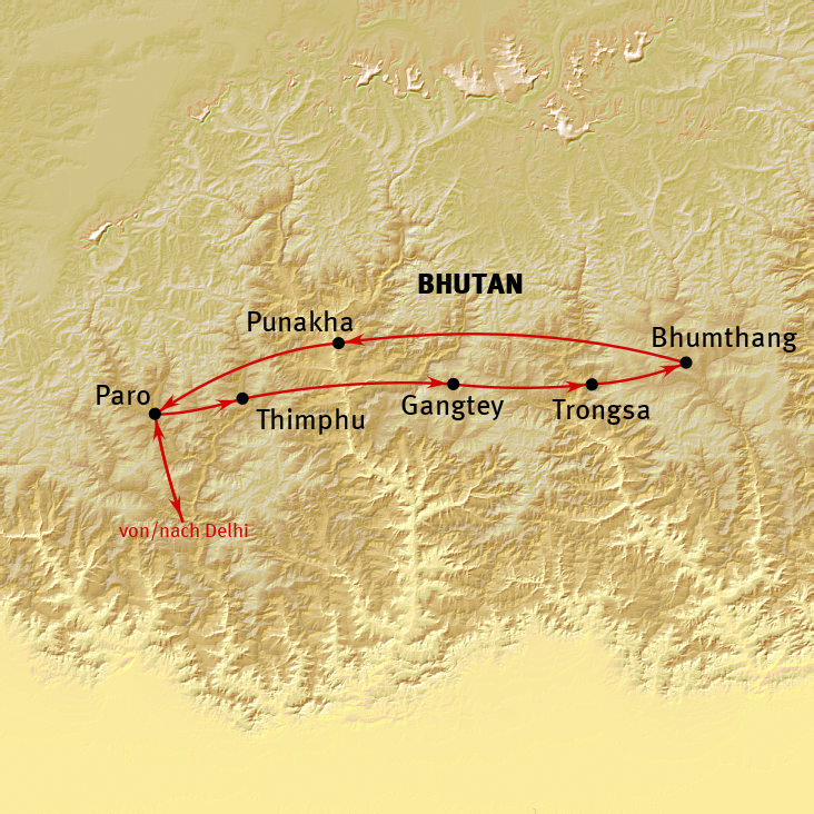 Inmitten der gewaltigen Gebirgskulisse des Himalayas liegt das kleine Königreich Bhutan, dessen Bevölkerung etwa so groß ist wie die von Frankfurt am Main. Diese verteilt sich auf viele einzigartige Täler, die mit ihrer Landschaft, ihren Städten und Klöstern aufwarten. Der Flug nach Paro ist atemberaubend: Vorbei an schneebedeckten Gipfeln und steilen Bergkämmen gelangen wir in das enge Paro-Tal, wo sich das Leben über Jahrhunderte kaum verändert hat. Die Natur ist unberührt und der buddhistische Glaube allgegenwärtig. Tradition hat höchste Priorität, sodass das Land behutsam für den Tourismus geöffnet wird. Auf unserer 15-tägigen Rundreise erleben wir die Höhepunkte Bhutans, genießen kleine Wanderungen und treffen auf die gastfreundliche Bevölkerung, stolz auf ihr glückliches Land.