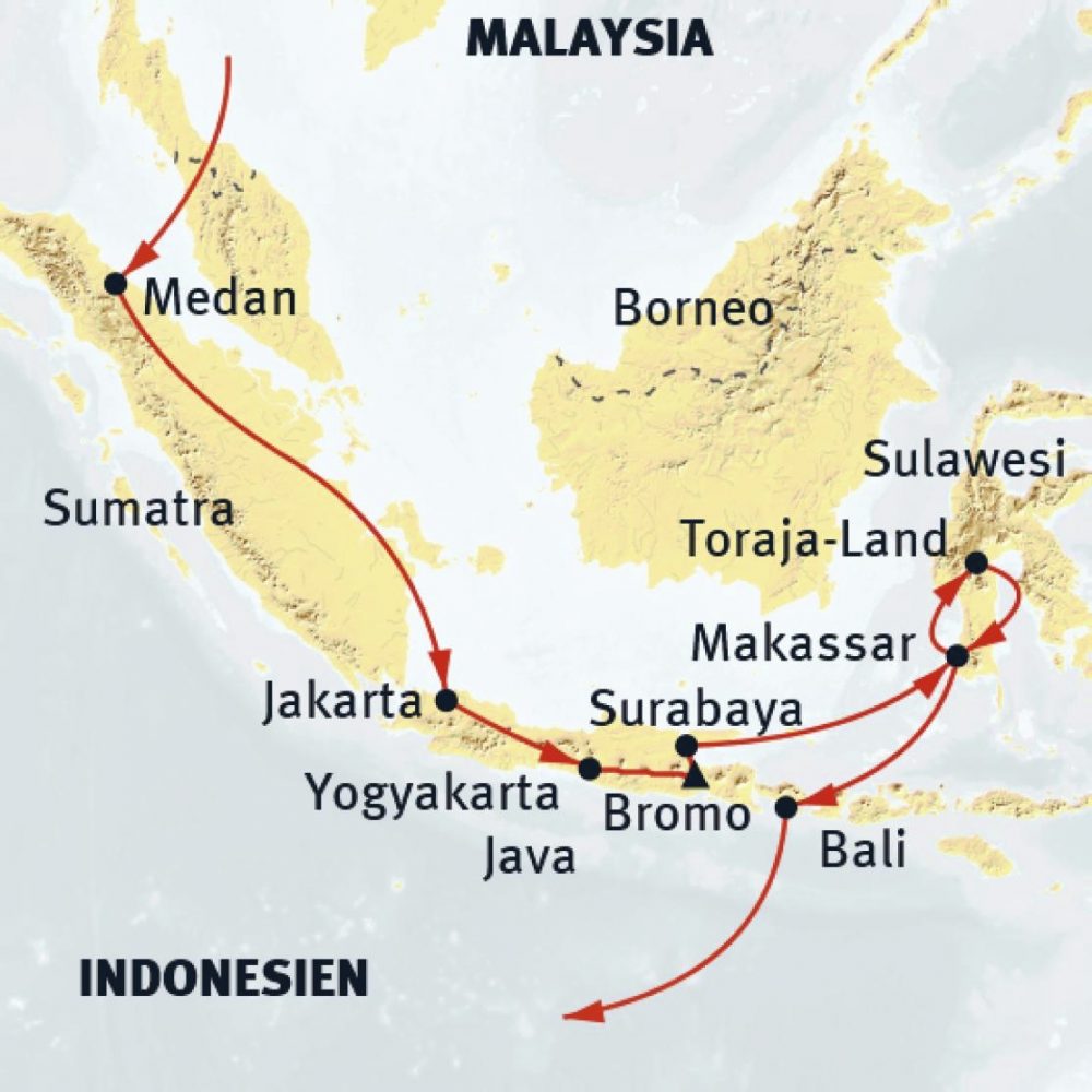 Keine andere Region in Südostasien hat so viele unterschiedliche Landschaftsräume und eine so reiche kulturelle Vielfalt zu bieten, wie das indonesische Archipel. Der Einfluss verschiedener Religionen und Kulturen hat auf den Inseln einzigartige Spuren hinterlassen. Auf Sumatra und Sulawesi finden wir archaische, animistische Kulturen bei den Batak- und Toraja-Völkern, während Java und Bali durch Islam, Hinduismus und Buddhismus geprägt sind. Besonders in Zentral-Java zeugen Baudenkmäler wie der Borobudur- oder Prambanan-Tempel von versunkenen Hochkulturen. In Bali wiederum hat sich eine ganz besondere Ausprägung des Hinduismus bis heute erhalten. Die freundlichen Menschen und das hoch entwickelte Kunstschaffen machen die Inselwelt faszinierend. Tropische Landschaften mit Vulkanen, Reisfeldern und Traumstränden laden zu einem Besuch ein. Wir möchten Ihnen diese Vielfalt näherbringen.
