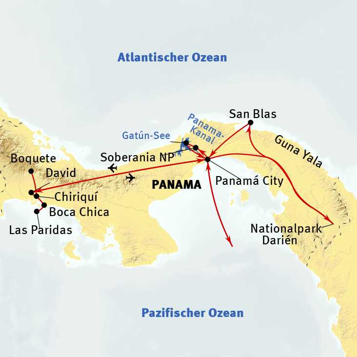 Panama bietet eine Vielfalt an Attraktionen. Nahezu alle Facetten Lateinamerikas, wie koloniale Städte, Regenwälder, Berglandschaften, Pazifik- und Atlantikküste mit Stränden, indigene Kulturen und Kaffeeanbau, sind auf kleiner Fläche zu erleben. Der Panama-Kanal ist ein einzigartiger Höhepunkt. Unser Programm bietet einen abwechslungsreichen Einblick in diese Vielfalt. Eine Woche verbringen wir in indigenen Gebieten mit minimaler Infrastruktur. Abenteuerlust ist dabei nötig, da der Zugang zu Basisinfrastruktur schwierig sein kann. Der Verzicht erlaubt uns jedoch, die Natur und das Leben der Menschen in noch weitgehend natürlichem Raum direkt zu erleben. Die meisten unserer Wanderungen dauern vier Stunden, im Darien, eine geschützte Provinz im Osten, bis zu sechs Stunden. Der Darien ist ein Biodiversitäts-Hotspot und Heimat der Embera. Ihr Regenwald ist bedroht, aber unsere Besuche unterstützen deren Schutzbemühungen. Wichtige Vorsichtsmaßnahme: Mückenschutz anwenden wegen Malaria- und Dengue-Risiko.