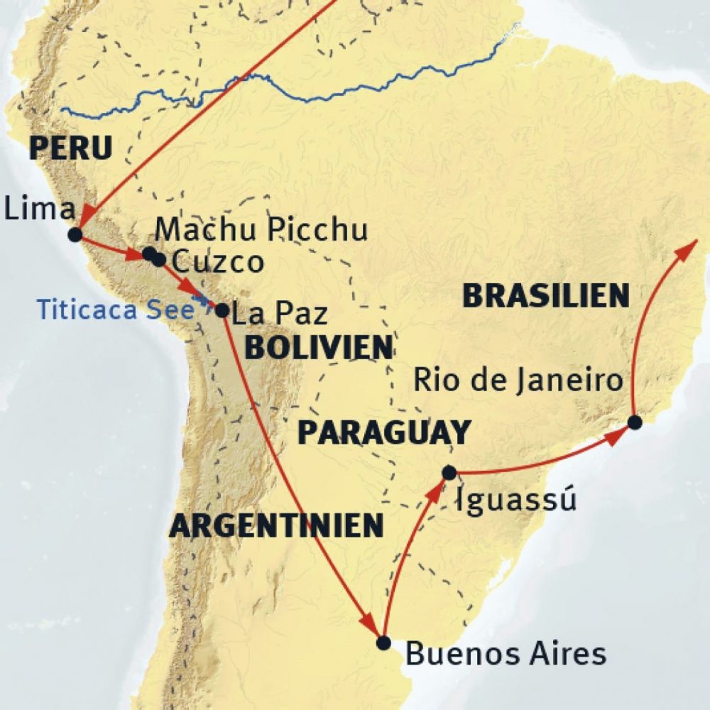 Was macht Südamerika aus und was sind die absoluten touristischen Höhepunkte des Kontinents? Wir bieten zwei Antworten darauf an: die "Große Südamerika-Rundreise" und die hier vorgestellte "Höhepunkte Südamerikas". Die letztere, eine kompakte Südamerika-Tour, zielt darauf ab, in kurzer Zeit ein umfassendes Erlebnis der wichtigsten Sehenswürdigkeiten des Subkontinents zu bieten. Wir beschränken uns auf vier Länder. Der Start ist in Peru, dem kulturhistorischen Zentrum mit zahlreichen archäologischen Stätten und präkolumbischen Monumenten in beeindruckender Landschaft. Bolivien, am Titicaca-See, mit Altiplano und authentischer Indio-Kultur, darf nicht fehlen. Weiter geht es zu den Rivalen Argentinien und Brasilien. Buenos Aires, Iguassú-Wasserfälle und Rio de Janeiro, die "schönste Stadt der Welt", sind beeindruckend. Diese Reise zeigt den Kontrast zwischen Anden-Hochland und atlantischem Tiefland, urbaner und ländlicher Umgebung sowie spanischer und portugiesischer Kultur.