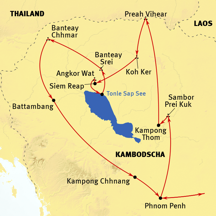Kambodscha, das kleinste Land Indochinas, begeistert seine Besucher ungemein. Zwischen imposanten Tempelanlagen und bewegender Geschichte, zwischen ländlicher Idylle und kreativen Aufbrüchen entfaltet sich hier ein faszinierender Kulturraum voller Kontraste. Unsere Reise lädt ein, dieses Land in seiner Tiefe zu erleben. Jenseits der bekannten Pfade, mit offenem Blick für Menschen, Geschichten und Begegnungen. Wir beginnen in Phnom Penh, am Zusammenfluss von Mekong und Tonle Sap. Hier schlägt das politische und kulturelle Herz des Landes, geprägt von kolonialem Erbe, moderner Urbanität und dem schmerzhaften Kapitel der Roten Khmer. Mit Fahrradrikscha, Boot und zu Fuß erkunden wir die Hauptstadt, kosten lokale Spezialitäten und lassen erste Eindrücke bei einem Rooftop-Cocktail über dem Flussufer auf uns wirken. Überland reisen wir weiter durch das ländliche Kambodscha, durch sattgrüne Reisfelder, kleine Marktstädte und unberührte Dörfer. Wir besuchen das UNESCO-Welterbe Sambor Prei Kuk, den majestätisch gelegenen Tempel von Preah Vihear und die längst vergessenen Anlagen von Koh Ker und Banteay Chhmar. Orte, die Geschichte atmen, oft einsam gelegen und gerade deshalb von besonderem Zauber. Im berühmten Angkor-Gebiet begegnen wir den großen Namen wie Angkor Wat oder Ta Prohm, aber auch feinen Details wie den filigranen Reliefs von Banteay Srei. Eine Fahrt mit der Vespa bringt uns direkt hinein ins Alltagsleben der Menschen rund um Siem Reap: auf Märkte, zu Pagoden, in Reiswein-Brauereien und Werkstätten. Immer wieder nehmen wir uns bewusst Zeit für das, was oft übersehen wird: das Gespräch mit einer Marktfrau, das Lächeln eines Kindes, den Klang von Musik in einem Dorf. Authentische Erfahrungen stehen im Mittelpunkt, sei es beim Mittagessen in einer Frauenkooperative, bei einer Führung durch das APOPO-Rattenprojekt zur Minenräumung oder beim Besuch des Theam’s House, eine Mischung aus Galerie, Museum und Werkstatt. Ein besonderer Höhepunkt ist der Aufenthalt auf dem Gelände von Smiling Gecko, einem großflächigen Sozialprojekt, das nachhaltige Landwirtschaft, Ausbildung und kulturelle Identität miteinander verbindet. Hier wird sichtbar, wie Entwicklung auf Augenhöhe gelingen kann. Ein Ort der Hoffnung und des Wandels. Diese Reise lebt vom bewussten Unterwegssein: von der Aufmerksamkeit für Zwischentöne, von Nähe statt Distanz, von stillem Staunen und lebendiger Anteilnahme. Wer Kambodscha mit Herz und Verstand erleben möchte, wird hier reich belohnt, mit unvergesslichen Bildern, Begegnungen und Geschichten.
