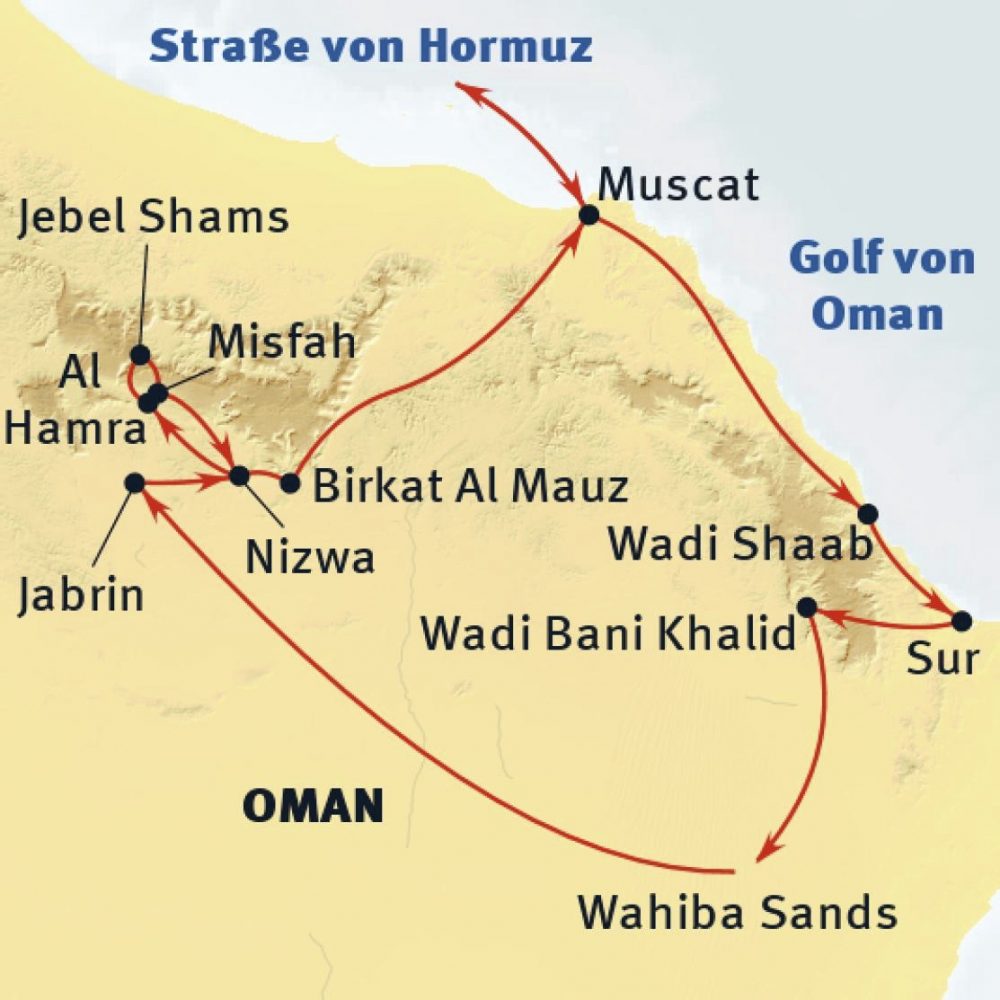 Unsere Reise in kleiner Gruppengröße fasst die Höhepunkte des Nordomans zusammen und lässt sich ideal mit einem Badeaufenthalt in Muscat oder Salalah kombinieren – gerne erstellen wir ein Angebot. Wer also das Sultanat kennenlernen möchte oder Erlebnis und Erholung verbinden will, der liegt hier genau richtig. Die Exkursionen finden in vollklimatisierten Fahrzeugen, beim Besuch der Wüste und des Gebirges im Geländewagen, statt.