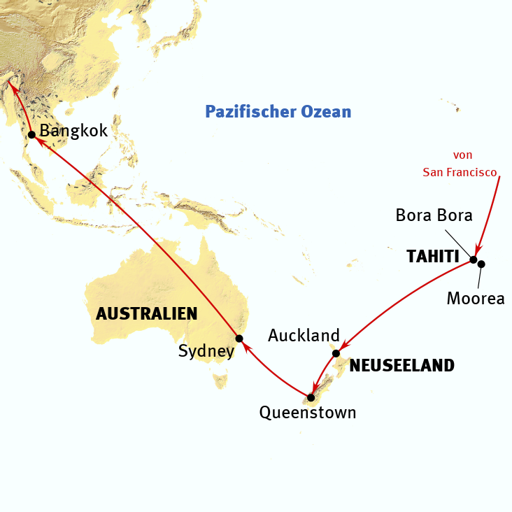 Eine Weltreise, der Höhepunkt vieler "Reisekarrieren", ist besonders erlebnisreich auf dieser Route: Start in San Francisco, für viele eine der schönsten Städte. Weiter nach Tahiti, Bora Bora und Moorea, berühmt für ihre unvergleichlichen Landschaften. Über Auckland zur Südinsel Neuseelands, bis nach Queenstown, der "Abenteuer-Spielplatz" des Landes. Dann zum Mt. Cook, höchster Berg Neuseelands. Weiter geht's nach Sydney, eine Stadt die mit ihrem Naturhafen, der Hafenbrücke und dem Opernhaus eine einmalig schöne Kulisse bietet. Schließlich Flug nach Bangkok, wo asiatische Vielfalt, buddhistische Tradition und moderne Großstadtkultur begeistern. Die Tour bietet eine große Vielfalt - ein Wechsel aus Südsee-Idylle, unberührten Weiten und Weltmetropolen. Geflogen wird mit bewährten Gesellschaften wie LUFTHANSA. Lokale Ausflüge sind englischsprachig oder deutsch geleitet; die Reise kann flexibel gestaltet werden und ist individuell verlängerbar, z.B. in der Südsee oder Australien. Ideal für Fortgeschrittene, die eine Mischung aus vorgebuchten Leistungen und Freiraum für eigene Aktivitäten schätzen.