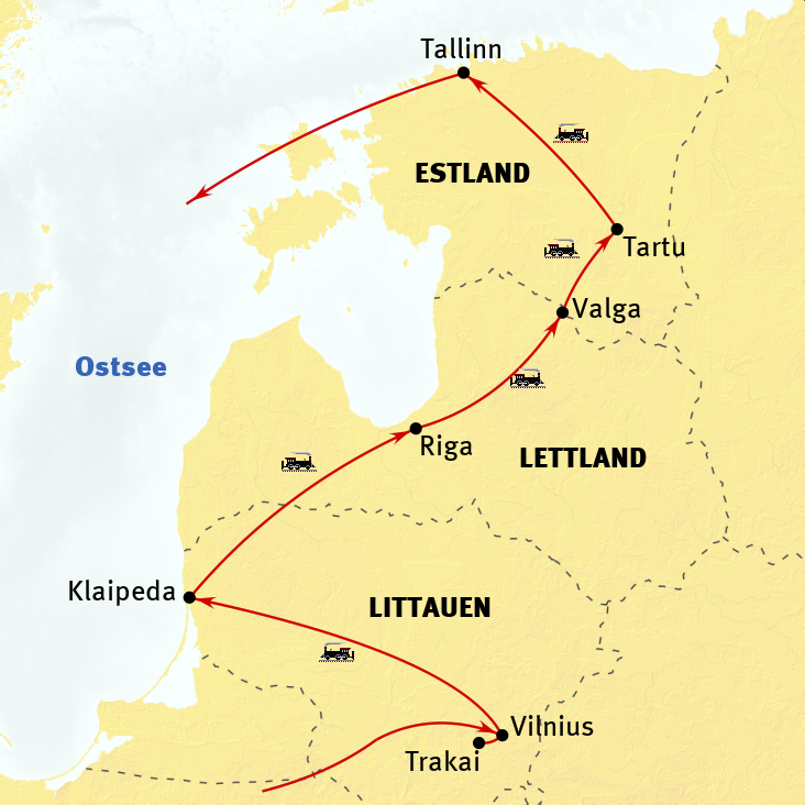 - deutsch sprachige Führungen in Vilnius und Trakai (2. Tag), Klaipeda (3. Tag), Riga (5. Tag), Tartu (7. Tag) und Tallinn (8. Tag)
