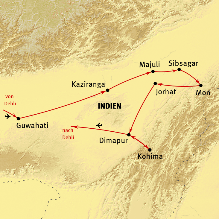 Die im Nordosten Indiens zwischen Bhutan, Tibet, Myanmar und Bangladesch gelegenen Provinzen sind nur durch einen schmalen Korridor mit dem Rest des Landes verbunden. Assam, Arunchal Pradesh und Nagaland gehören zu den am wenigsten besuchten und touristisch erschlossenen Teilen Indiens. Eine Reise hierher gewährt tiefe Einblicke in ein kaum bekanntes Indien: Wir besuchen zurückgezogen lebende Ethnien und entdecken die abwechslungsreichen Landschaften mit Dschungelwäldern und Teeplantagen, die erstklassigen Tee hervorbringen. Die Völker in diesen Gebieten leben kulturell unabhängig und sprechen eigene Sprachen. Zudem erkunden wir den Kaziranga-Nationalpark in Assam, ein UNESCO-Weltkulturerbe mit seltener Tierwelt. Diese Reise richtet sich an Neugierige, die das ursprüngliche, unberührte Indien erleben möchten und bereit sind, auf Luxus zu verzichten, um authentische Begegnungen zu genießen.