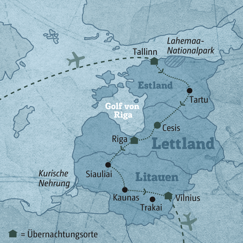 - Wechselnde örtliche, Deutsch sprechende Reiseleitung während der Stadtbesichtigungen in Tallinn, Riga und Vilnius (durchgehende Deutsch sprechende Reiseleitung von Tallinn bis Vilnius gegen Aufpreis auf Anfrage); keine Reiseleitung an den Besichtigungsorten während der Überlandfahrten