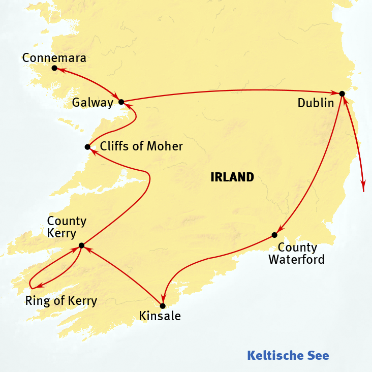 Irland unter dem Motto „Keltische Schätze“ führt in die faszinierende Welt der Grünen Insel, die mit ihren geheimnisvollen Mythen, dramatischen Küstenlandschaften und dem Charme traditioneller irischer Kultur verzaubert. Der Auftakt der dieser Entdeckerreise ist Dublin, eine Stadt, in der Geschichte und Moderne perfekt miteinander verschmelzen. Die historischen Gassen, beeindruckenden Gebäude und das quirlige Leben rund um die Temple Bar spiegeln das einzigartige Flair der Hauptstadt wider. Weiter geht es ins County Kildare, wo das Irische Nationalgestüt einen faszinierenden Einblick in die Welt der Pferdezucht gibt. In Kilkenny zählt die Butler Gallery zu einem kulturellen Highlight und ist bekannt für ihre Sammlung irischer Kunst. Waterford Stadt, Irlands älteste Stadt, gibt mit ihren mittelalterlichen Gassen und historischen Gebäuden einen tiefen Einblick in die reiche Geschichte des Landes. Die Skellig Six18 Distillery, die sich inmitten der zerklüfteten Landschaft der Skellig-Küste erhebt, vermittelt Besuchern nicht nur alles über die Tradition des Destillierens, sondern auch interessante Einblicke in die Geschichte und den Charakter der irischen Landschaft. Der legendäre Ring of Kerry, eine der bekanntesten Panoramastraßen der Welt, fasziniert mit spektakulären Ausblicken auf grüne Hügel, malerische Dörfer und eine wilde Küstenlandschaft. Die beeindruckenden Cliffs of Moher, deren imposante Klippen direkt in den Atlantik abfallen, hinterlassen einen bleibenden Eindruck und sind ein Muss auf jeder Irlandreise. Ebenso Connemara, wo die unberührte Natur Irlands erlebbar wird – mit schimmernden Seen, sanften Hügeln und dramatischen Bergen. Diese Reise ist eine Entdeckungstour durch die wahren „Keltischen Schätze“ Irlands – eine Reise voller Geschichte, Tradition und unvergesslicher Landschaften.