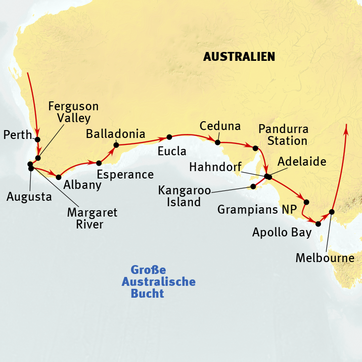 Entlang der Südküste Australiens gibt es kaum Reisemöglichkeiten, um die vielen Höhepunkte dieses kontrastreichen Küstenstreifens in einer Kleingruppe zu erleben. Hier bieten wir nun eine durchweg deutschsprachige Variante an, bei der es vom äußersten Westen in Perth bis zur Metropole Melbourne innerhalb eines fast drei Wochen andauernden Roadtrips geht.