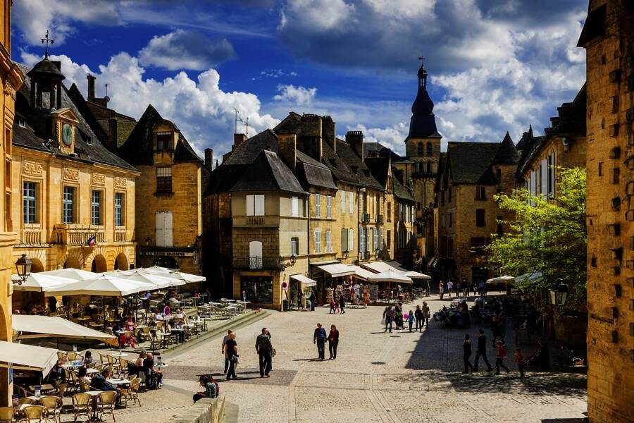 Kein Wunder, dass in Sarlat immer wieder Filme gedreht werden: Die honiggelbe Renaissancestadt mit ihren Palästen, Kirchen und Plätzen ist eine wahre Schönheit! Heute am Markttag präsentieren sich zudem alle kulinarischen Stars der Gegend: Feinschmecker schweben hier im Genießerhimmel! Wir schnuppern hier und kosten dort, um den Picknickkorb zu füllen. Dann ziehen wir mit Obst, Käse, Pasteten und ein paar Flaschen Wein zu den Gärten von Marqueyssac - der wohl schönste Park des Périgords, der auf einem Felssporn über der Dordogne thront. Nach einem wahrhaft königlichen Picknick der letzte Zungenkitzler des Tages: Wir kosten das berühmte Walnussöl des Périgords. 40 km. Heute Abend in Sarlat sucht sich jeder nach Lust und Laune sein Plätzchen für Aperitif und Abendessen. (F, P)