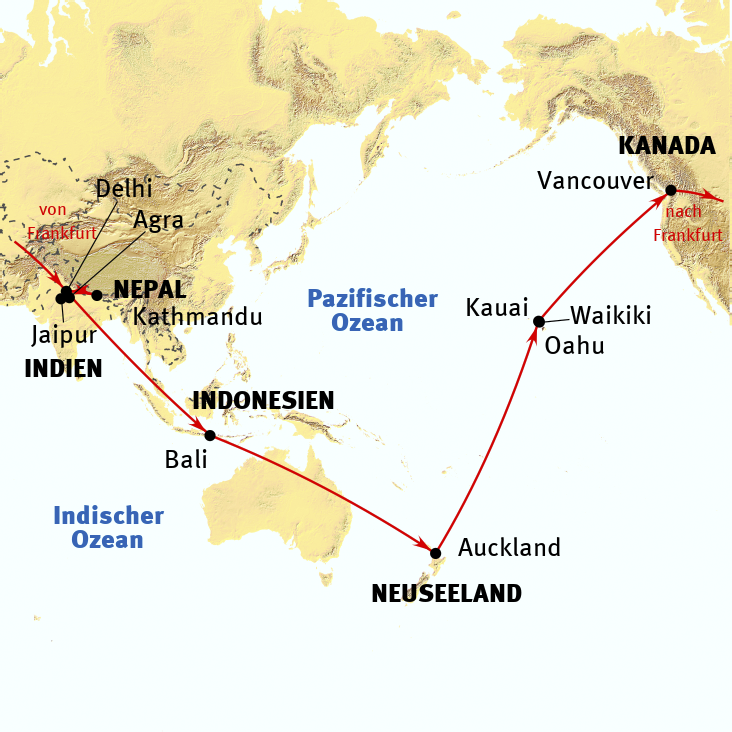 Weltreisen gewinnen an Popularität. Der Gedanke der Weltumrundung bietet zahlreiche Gestaltungsoptionen. Unsere Route führt zuerst zu Höhepunkten in Nordindien – Delhi, Jaipur, Agra – und in das Himalaya-Gebirge, nach Nepal. Auf dem Weg zur Südhalbkugel besuchen wir Bali, „Insel der Götter“. Weiter geht es über Auckland in das nördliche Polynesien zu den Inseln Hawaiis. Abschluss der Reise sind Tage in Vancouver, mit Großstadt und Natur, inklusive einem Rundflug mit Wasserflugzeug. Die Reise erfolgt individuell, bietet viel Freiraum und wechselt programmintensive Tage mit Zeit für eigene Unternehmungen ab. An kulturell bedeutenden Orten begleiten uns lokale Experten, anderswo wählen Reisende selbst ihre Aktivitäten aus. Es besteht die Möglichkeit, Aufenthalte zu verlängern, weitere Tage auf Bali, ein erweitertes Neuseeland-Programm oder zusätzliche Inseln im Hawaii-Archipel wie Maui oder Big Island einzuplanen.