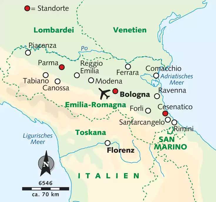Die Emilia-Romagna – das kulinarische Herz Norditaliens – vereint Kultur, Genuss und Natur auf einzigartige Weise. Flaniere durch die eleganten Gassen Parmas, wo der Duft von Prosciutto und Parmesan in der Luft liegt, und lass dich vom lebendigen Bologna mit seinen mittelalterlichen Türmen und seiner unvergleichlichen Küche verzaubern. Wandere durch malerische Landschaften, sanfte Hügel und grüne Weinberge, die die Region prägen. Lass dich von San Marino – der ältesten Republik der Welt – mit ihren beeindruckenden Festungen und spektakulären Ausblicken in vergangene Zeiten entführen. Und natürlich darf die Adria nicht fehlen, Cesenatico mit seinen bunten Fischerbooten im historischen Hafen wartet schon auf dich. Diese Reise ist mehr als Wandern – sie verbindet Natur, Kultur und Genuss auf perfekte Weise. Lass dich von der Schönheit der Emilia-Romagna begeistern und erlebe unvergessliche Momente in einer Region voller Geschichte, Lebensfreude und kulinarischer Köstlichkeiten.