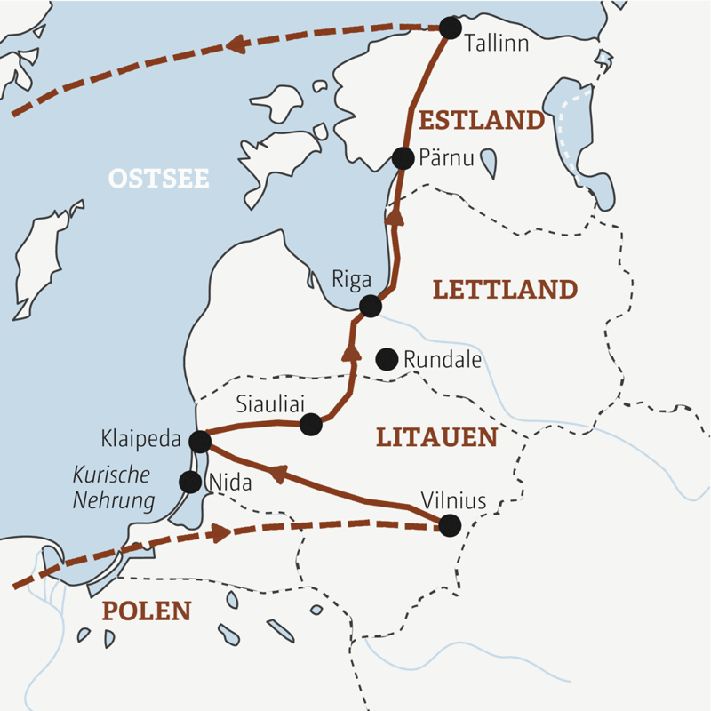 Drei Länder, drei Sprachen, drei Kulturen: Erleben Sie auf dieser Rundreise durch das Baltikum einen spannenden Mix aus historischen Mauern, elektronischer Zukunft und traumhaften Landschaften: In sieben Tagen entdecken wir die Hauptstädte Vilnius, Riga und Tallinn. Natürlich darf auch Klaipeda mit dem "Ännchen von Tharau" nicht fehlen. Wer Lust hat, bucht Ausflüge auf die Kurische Nehrung oder zu Rastrellis Prachtschloss Rundale dazu.