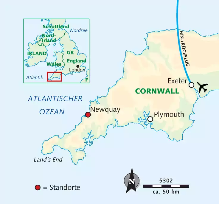 Hotel: Wir übernachten in Newquay im The Griffin Inn. Das Hotel befindet sich im Stadtzentrum und verfügt über ein Restaurant und eine Bar. Zimmer: Die Zimmer sind ausgestattet mit TV, WLAN, Föhn und Wasserkocher zur Kaffee- und Teezubereitung. Verpflegung: Frühstück und Abendessen im Hotel Lage: im Zentrum von Newquay. Das Hotel liegt etwas erhöht auf den Klippen. Der Strand ist nur wenige Minuten entfernt. Newquay ist der ideale Ausgangspunkt, um Cornwalls dramatische Nordküste zu entdecken.
