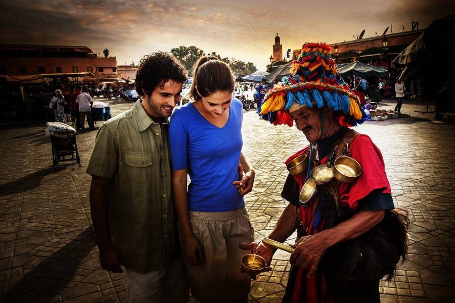 Genießen Sie Ihren freien Tag in der königlichsten Stadt Afrikas! Open-Air-Theater à la marocaine bietet sich Ihnen auf dem Djemaa el-Fna. Bilder wie aus dem Märchen.
