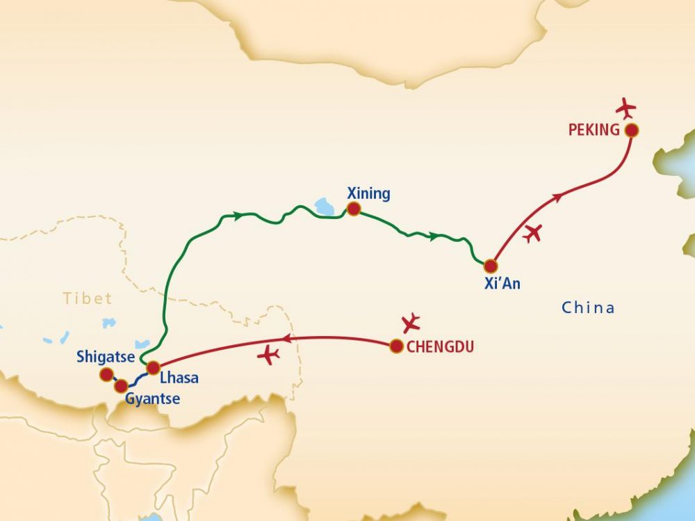 - 2 innerchinesische Flüge: Chengdu – Lhasa und Xi´an– Peking