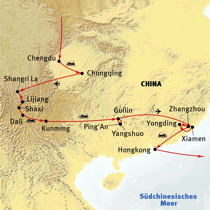 - durchgehend deutsch spr. Reiseleitung ab Chengdu / bis Zhangzhou sowie örtl. deutsch spr. Reiseleitung in Hongkong