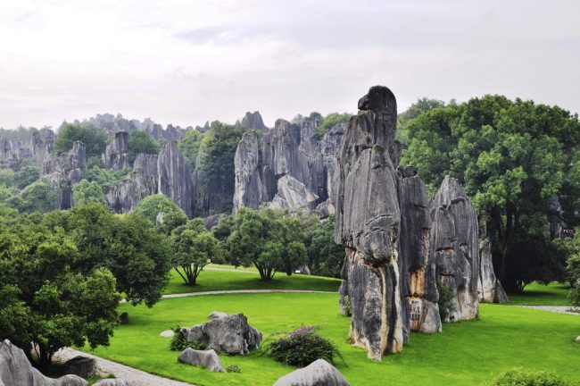Wir starten mit dem Transfer zum Bahnhof und machen uns anschließend in einem modernen Schnellzug 2. Klasse auf den Weg nach Kunming – eine entspannte Fahrt von etwa zwei Stunden. Dort angekommen, erleben wir den beeindruckenden Steinwald mit seinen bizarren Sandsteinformationen, die wie versteinerte Wälder zwischen Nebel und Grün aufragen.