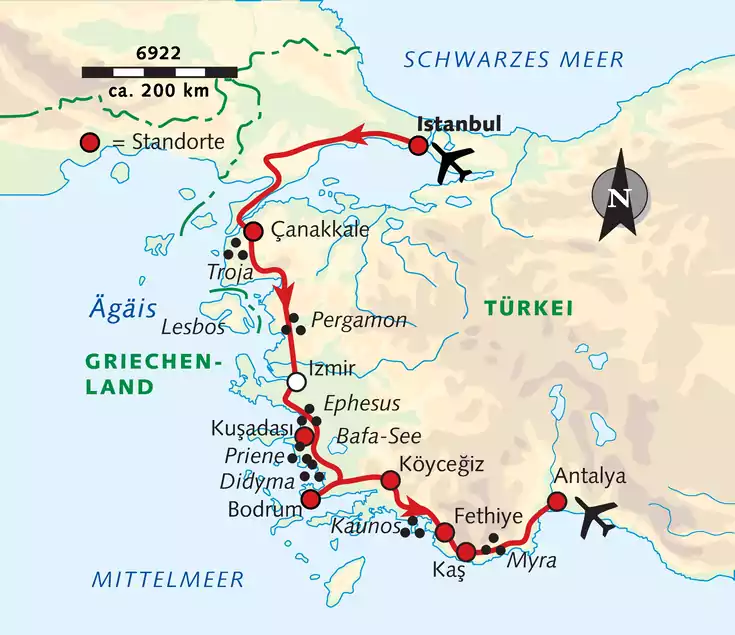 Vor über 40 Jahren startete die erste Wikinger-Rundreise in Westanatolien. Damals wie heute steht der Name "Türkei-Safari" für eine "Rundreise mit Abenteuercharakter". Wir erkunden die Westtürkei von Nord nach Süd, von Istanbul bis nach Antalya. Entlang der Ägäisküste bestaunen wir die historischen Orte Troja, Pergamon, Ephesos und Bodrum. Als krönender Abschluss unserer Reise erwarten uns die malerischen Buchten und antiken Schätze der lykischen Küste. Komm mit und entdecke die Highlights der Westtürkei!
