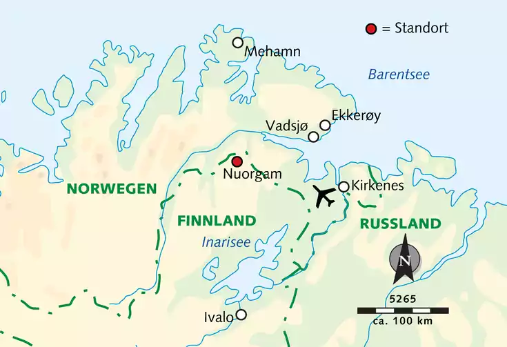 Hotel: Umgeben von spektakulären Landschaften, haben unsere Gastgeber Marjatta und Raimo mit dem Nuorgam Holiday Village ein kleines Paradies für Ruhesuchende geschaffen. Luxus suchst du hier vergeblich, doch fühlst du dich sofort zu Hause. Es gibt ein Restaurant mit angeschlossenem Café. In der Bar/Lounge kannst du in entspannter Atmosphäre einen Drink genießen. Am Flußufer gibt es eine Sauna, der Besuch für uns 2 x inklusive. WLAN steht in den öffentlichen Bereichen kostenfrei zur Verfügung. Zimmer: Wir übernachten in zweckmäßig ausgestatteten Ferienwohnungen/Apartments, die mit Bad oder Dusche/WC sowie einer kleinen Küche ausgestattet sind. Je zwei Einzelzimmer befinden sich in den größeren Ferienwohnungen/Apartments und teilen sich ein gemeinsames Bad. Verpflegung: Morgens bedienen wir uns am Frühstücksbüfett. Das ausgezeichnete Abendessen mit lokalen Spezialitäten wird entweder als Drei-Gang-Menü oder in Büfettform im Restaurant der Ferienanlage serviert. Lage: Nuorgam ist ein kleines Dorf mit 400 Einwohnern und bescheidener Infrastruktur, ganz im Norden Finnlands und in unmittelbarer Nähe zur norwegischen Grenze gelegen. Die nächstgrößere Gemeinde Utsjoki ist ca. 45 km entfernt.