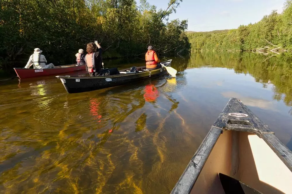 Für die Kanutour sind keine Vorkenntnisse erforderlich. Nach einer kurzen Einweisung genießen wir Lappland von einer ganz besonderen Perspektive vom Wasser aus.