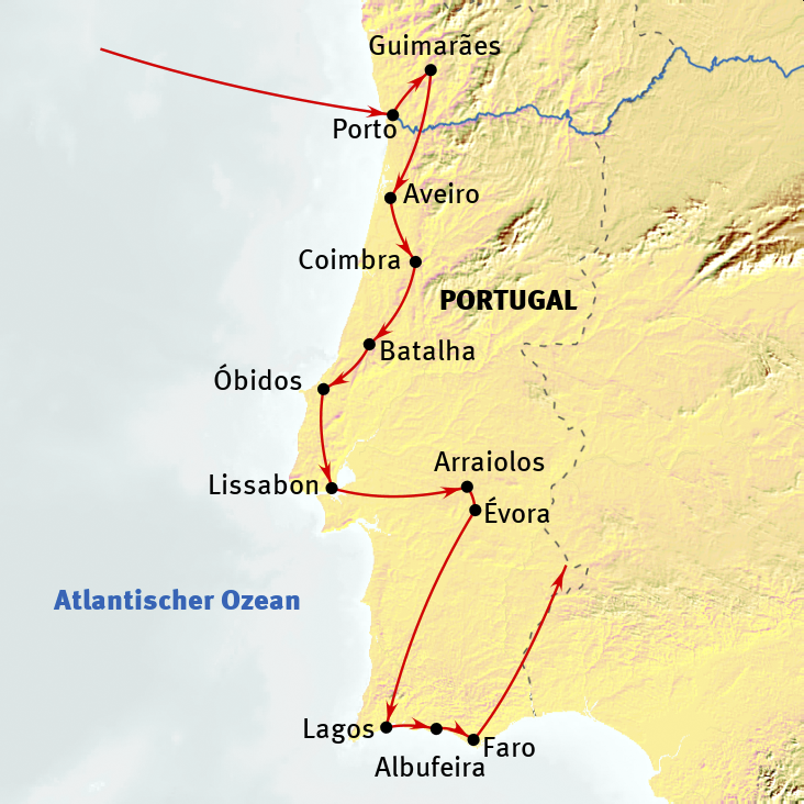 Portugal ist heute ein beliebtes Reiseziel am westlichen Ende Europas. Das Land beeindruckt mit mildem Klima und einer abwechslungsreichen Atlantikküste. Lissabon, die "Weiße Stadt", gilt als eine der schönsten Metropolen der Welt, gebaut auf sieben Hügeln am Tejo. Das dynamische Porto, berühmt für seine Weinkeller, wird oft als „heimliche Hauptstadt“ der Portugiesen betrachtet. Unsere einwöchige Rundreise führt auch zu Traditionsorten wie Coimbra, dem "Venedig Portugals" Aveiro, und der malerischen Kleinstadt Óbidos. Weitere Highlights sind die UNESCO-Weltkulturerbestätten Évora und Guimarães. Besonders Évora bietet beeindruckende historische Zeugnisse. Zum Abschluss der Reise erwartet uns die sonnige Algarve, ideal für einen Badeaufenthalt.