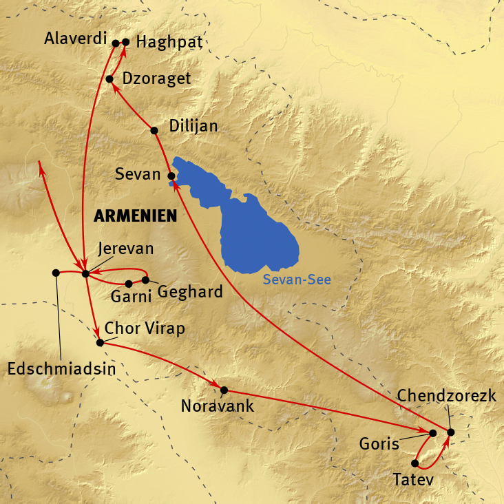 Von der modernen, lebhaften Hauptstadt Jerewan aus, entdecken wir das Land von recht überschaubarer Größe fast sternförmig; zunächst nach Etschmiadsin, zum zentralen Sitz der armenisch-gregorianischen Kirche, dann zu den Klöstern in der Ararat-Ebene, Chor Virap und Noravank, immer den biblischen Ararat im Blick, den heiligen Berg der Armenier, der aber hinter der Grenze in der Türkei liegt. Im Süden dann das seltener besuchte, aber nicht minder imposante Kloster Tatev, das wir mit einer Pendelseilbahn erreichen, sowie im Norden Kloster Haghpat an der Debed-Schlucht. Jedoch hat Armenien auch einmalige Naturwunder, wie den auf fast 2000 m Höhe gelegenen Sevan-See, zu bieten, oder die Basaltformationen in der Azat-Schlucht, am Fuße des einzigen erhaltenen heidnischen Tempels Garni im Kaukasus. Aus vorchristlicher Zeit finden sich desweiteren die mystische (Kult)stätte Zorakaer mit ihren Meniren und die uralten Petroglyphen von Sevsar.